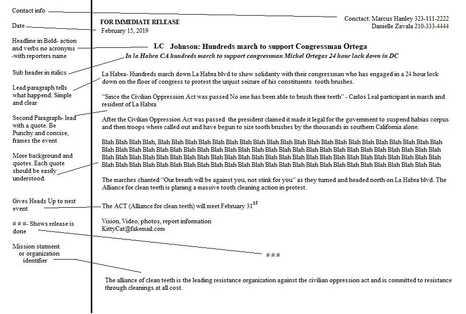 It is important to have a media list. If you are working the campaign with an allied organization, you can ask them for theirs. Chances are they have one. If not, your group can create their own. Include the AP (Associated Press).